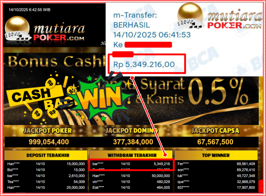 Bukti Withdraw ( 5,349,216,- ) Member Setia MutiaraPoker