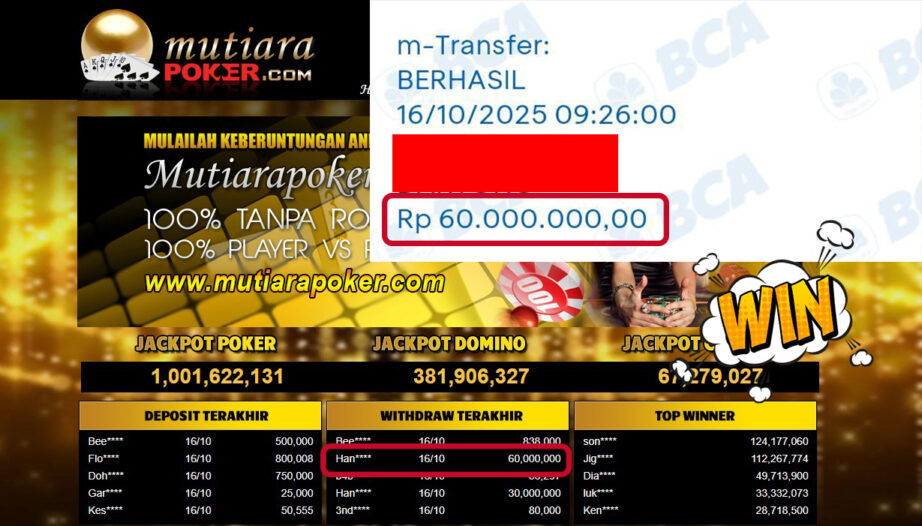 Bukti Withdraw ( 60,000,000,- ) Member Setia MutiaraPoker