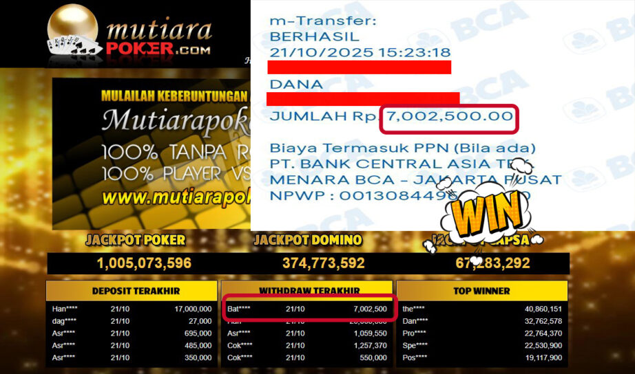 Bukti Withdraw ( 7,002,500,- ) Member Setia MutiaraPokerc