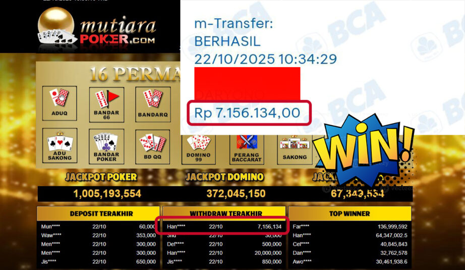 Bukti Withdraw ( 7,156,134,- ) Member Setia MutiaraPokerc