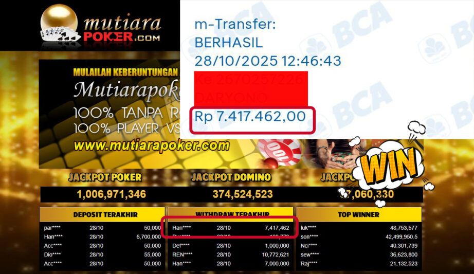 Bukti Withdraw ( 7,417,462,- ) Member Setia MutiaraPoker