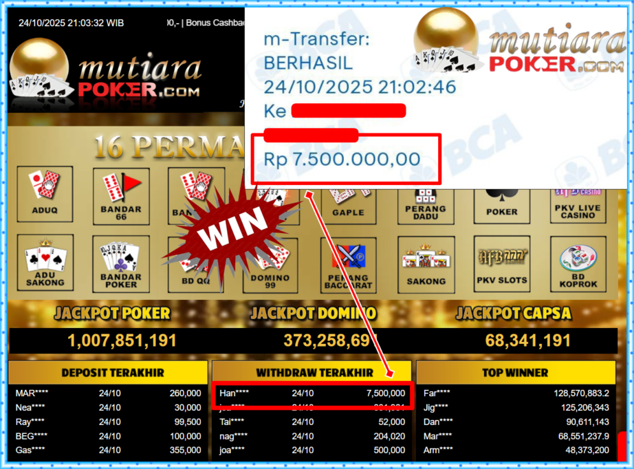 Bukti Withdraw ( 7,500,000,- ) Member Setia MutiaraPoker