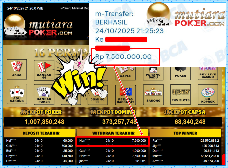 Bukti Withdraw ( 7,500,000,- ) Member Setia MutiaraPoker