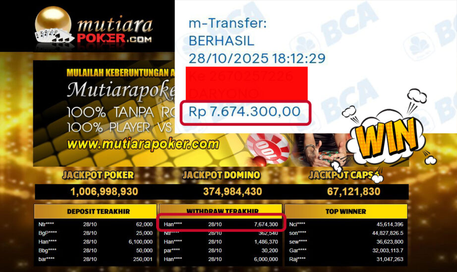 Bukti Withdraw ( 7,674,300,- ) Member Setia MutiaraPoker