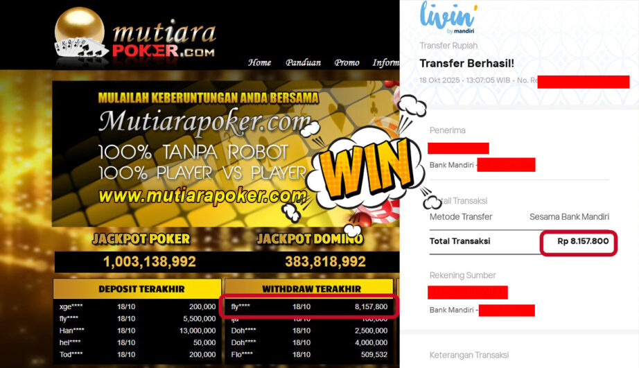 Bukti Withdraw ( 8,157,800,- ) Member Setia MutiaraPoker