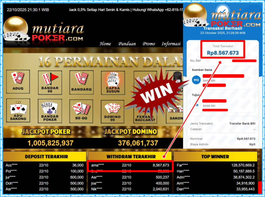 Bukti Withdraw ( 8,567,673,- ) Member Setia MutiaraPokerc