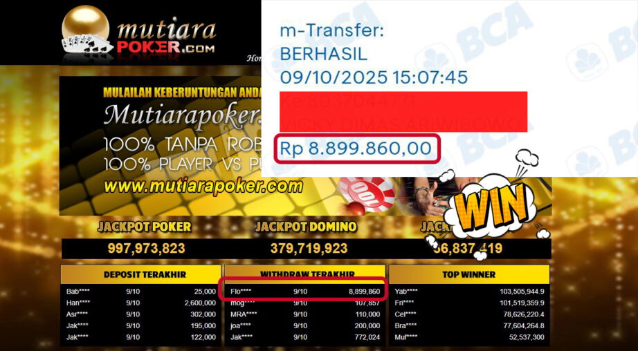 Bukti Withdraw ( 8,899,860,- ) Member Setia MutiaraPoker