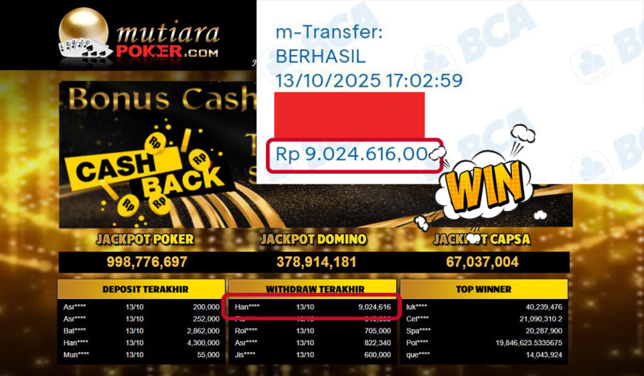 Bukti Withdraw ( 9,024,616,- ) Member Setia MutiaraPoker
