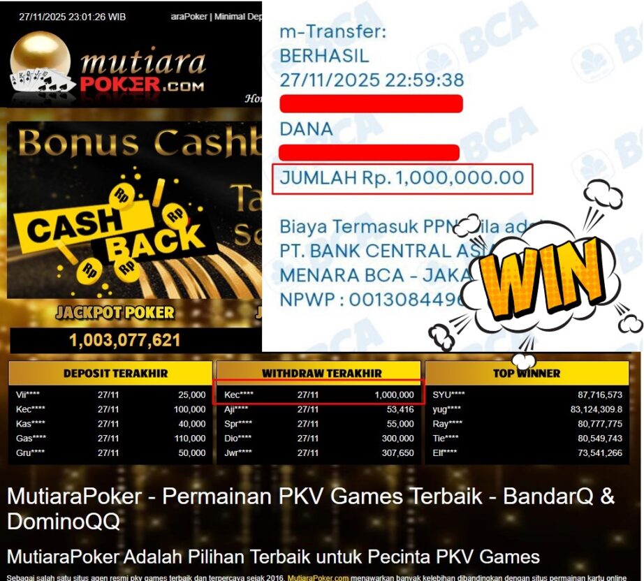 Bukti Withdraw ( 1.000.000,- ) Member Setia MutiaraPoker