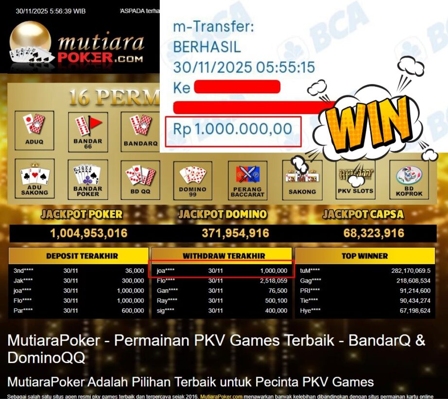 Bukti Withdraw ( 1.000.000,- ) Member Setia MutiaraPoker
