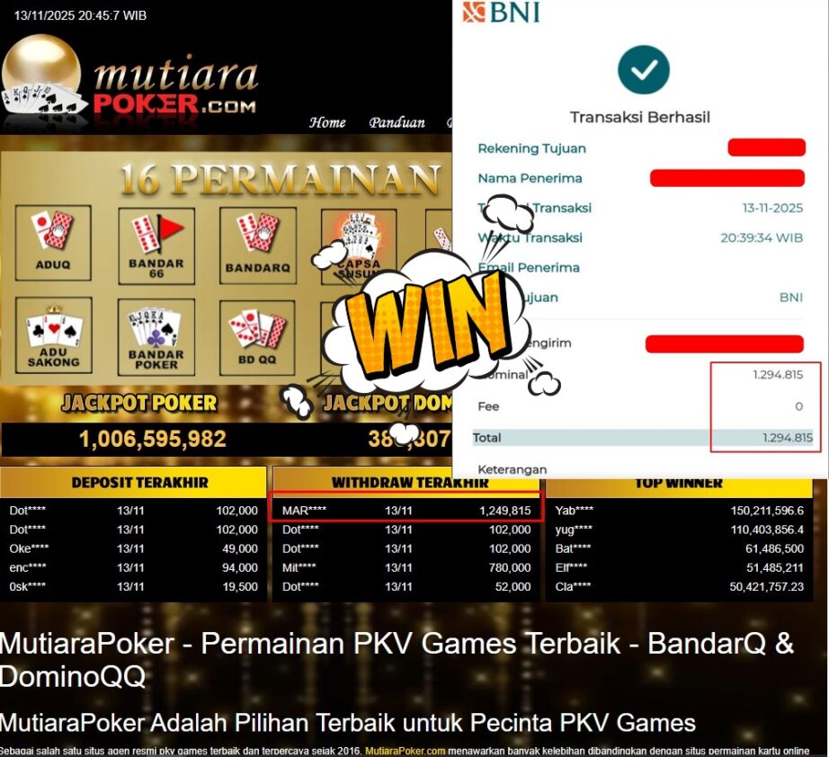 Bukti Withdraw ( 1.249.815,- ) Member Setia MutiaraPoker