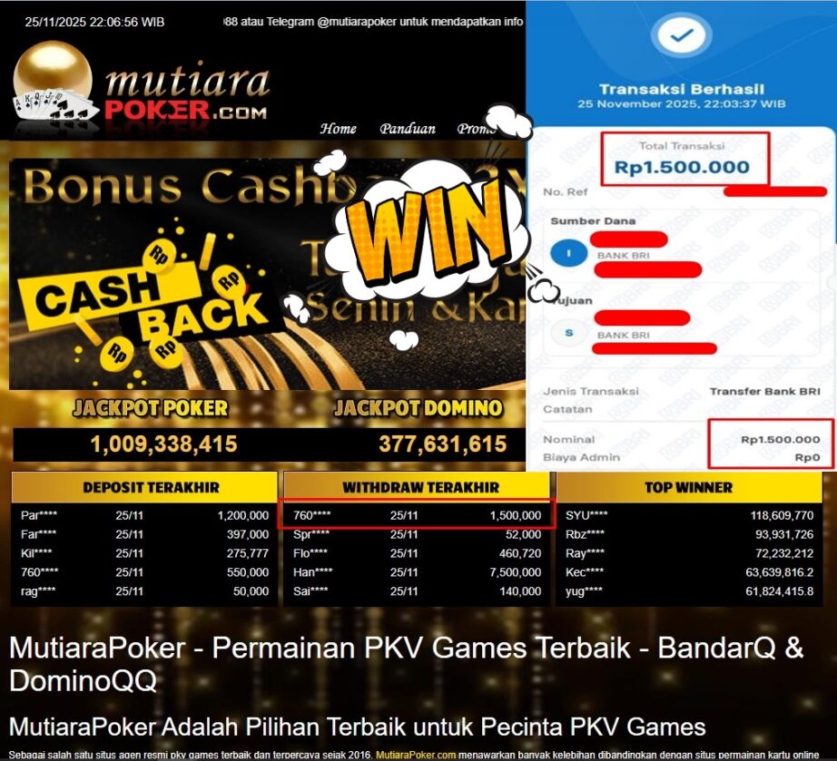 Bukti Withdraw ( 1.500.000,- ) Member Setia MutiaraPoker