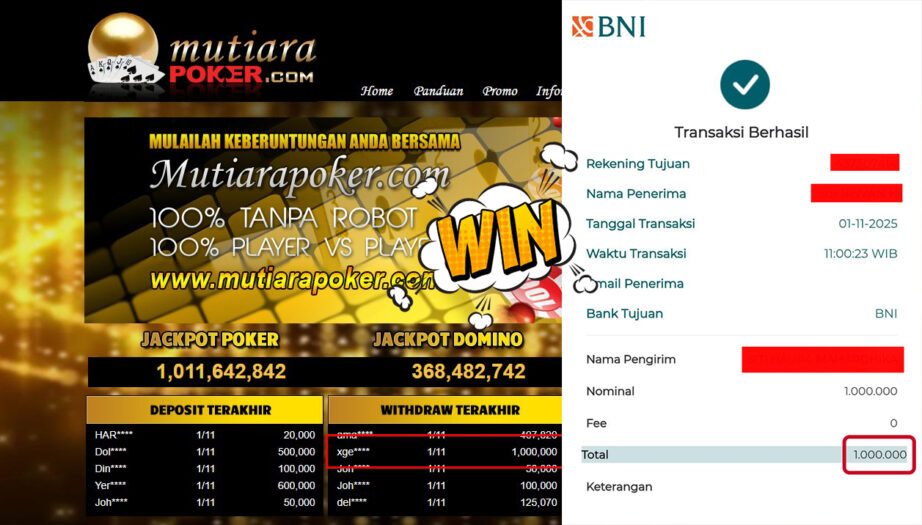 Bukti Withdraw ( 1,000,000,- ) Member Setia MutiaraPoker