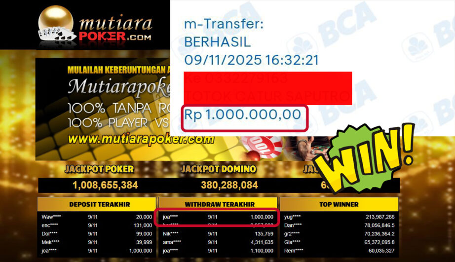 Bukti Withdraw ( 1,000,000,- ) Member Setia MutiaraPoker