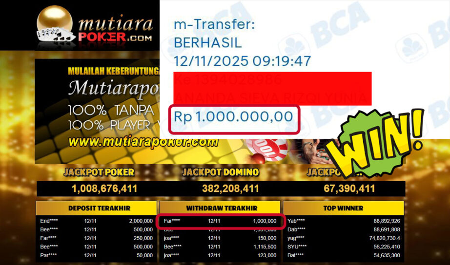 Bukti Withdraw ( 1,000,000,- ) Member Setia MutiaraPoker