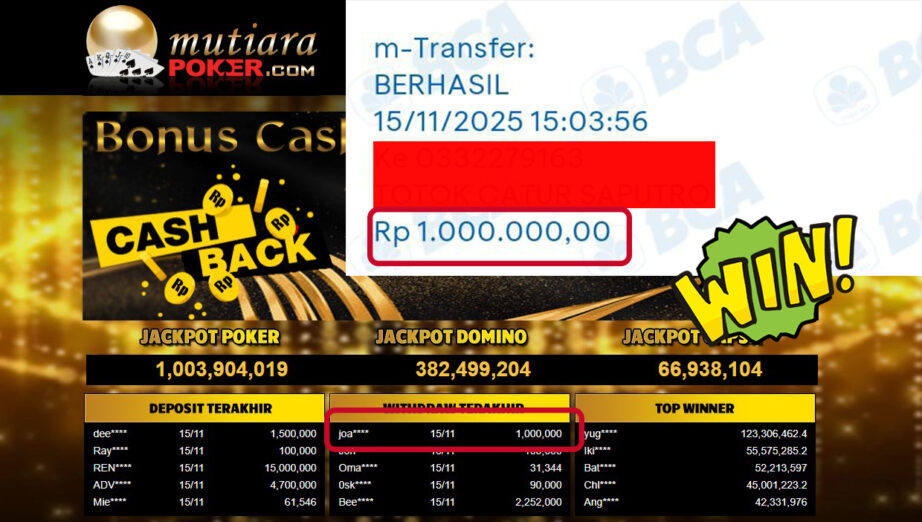 Bukti Withdraw ( 1,000,000,- ) Member Setia MutiaraPoker
