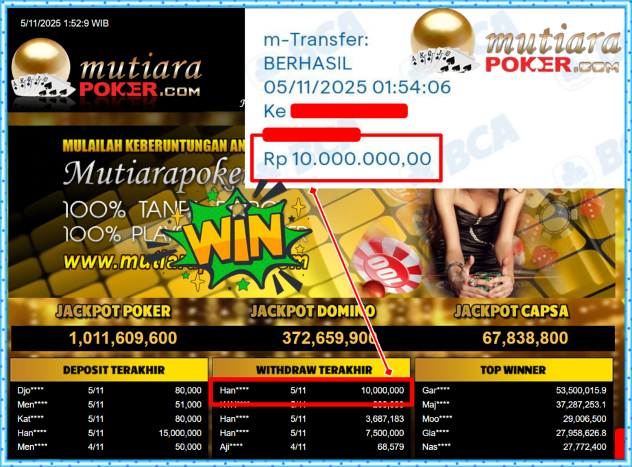 Bukti Withdraw ( 10,000,000,- ) Member Setia MutiaraPoker