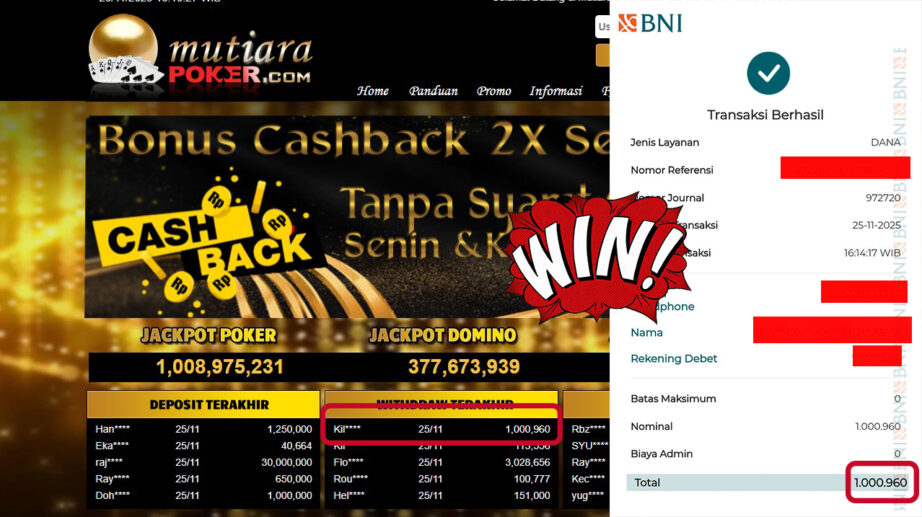Bukti Withdraw ( 1,000,960,- ) Member Setia MutiaraPoker