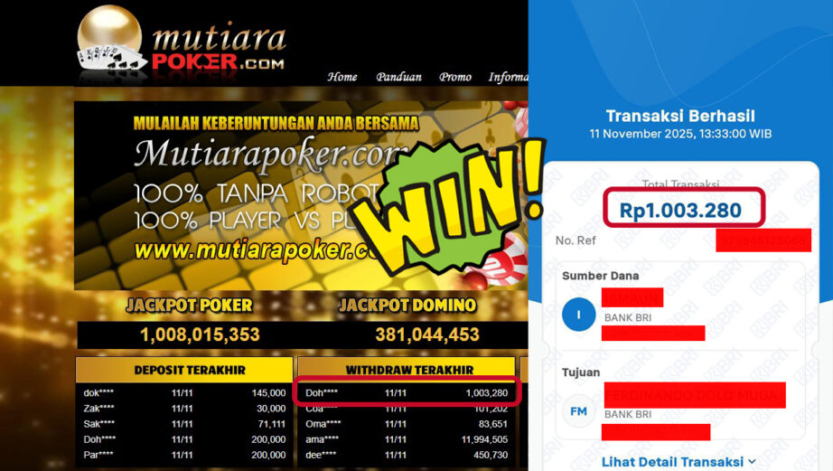 Bukti Withdraw ( 1,003,280,- ) Member Setia MutiaraPoker