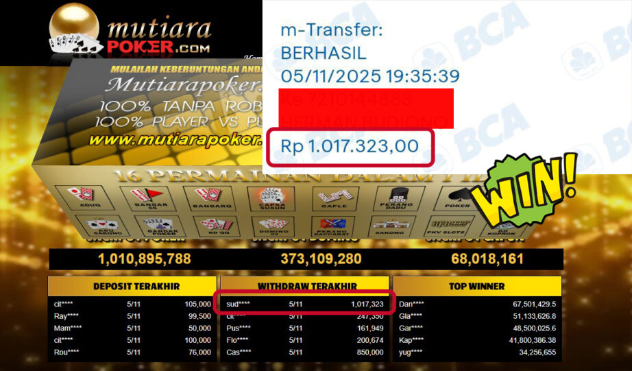 Bukti Withdraw ( 1,017,323,- ) Member Setia MutiaraPoker