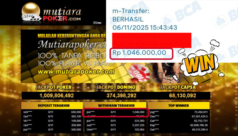 Bukti Withdraw ( 1,046,000,- ) Member Setia MutiaraPoker