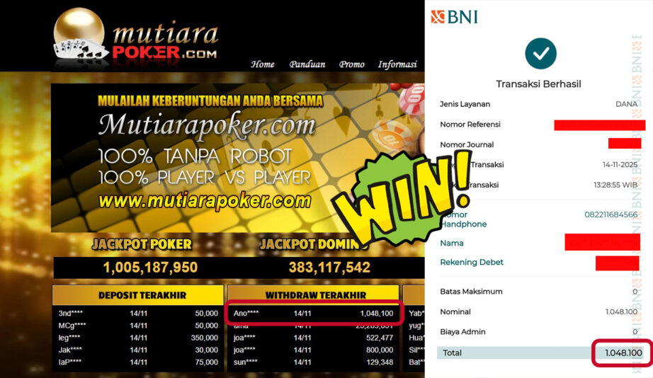 Bukti Withdraw ( 1,048,100,- ) Member Setia MutiaraPoker