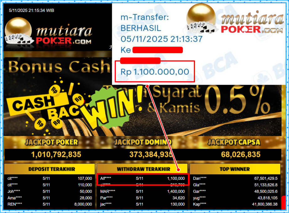 Bukti Withdraw ( 1,100,000,- ) Member Setia MutiaraPoker