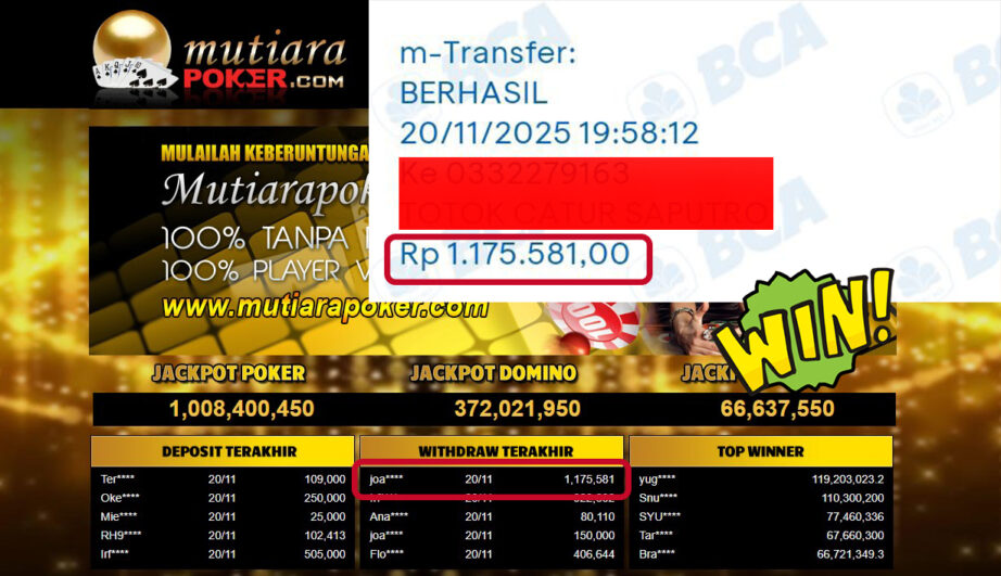 Bukti Withdraw ( 1,175,581,- ) Member Setia MutiaraPoker