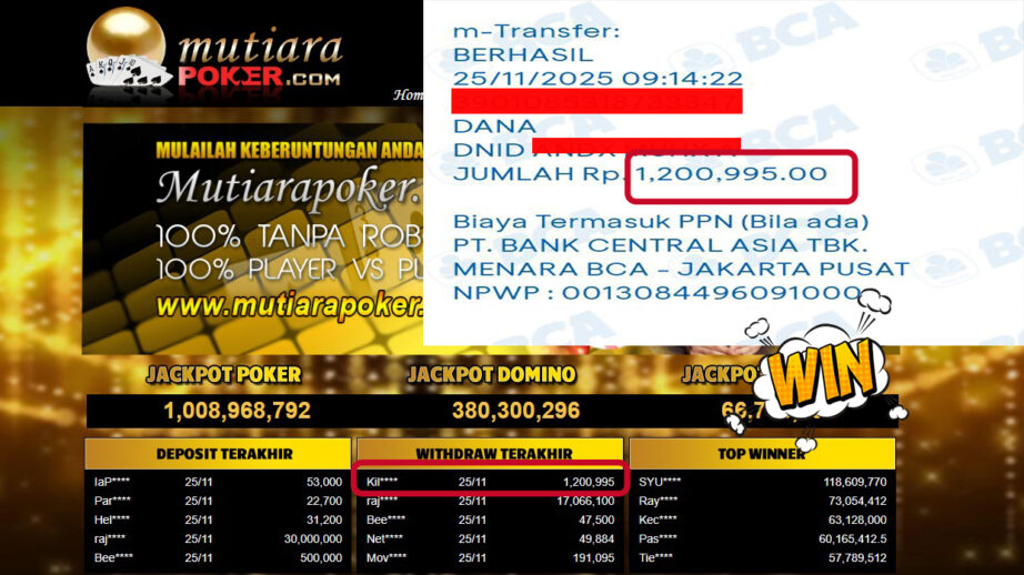 Bukti Withdraw ( 1,200,995,- ) Member Setia MutiaraPoker