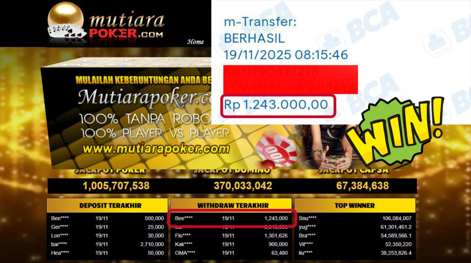 Bukti Withdraw ( 1,243,000,- ) Member Setia MutiaraPoker