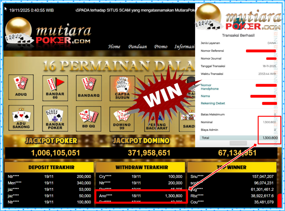 Bukti Withdraw ( 1,300,800,- ) Member Setia MutiaraPoker