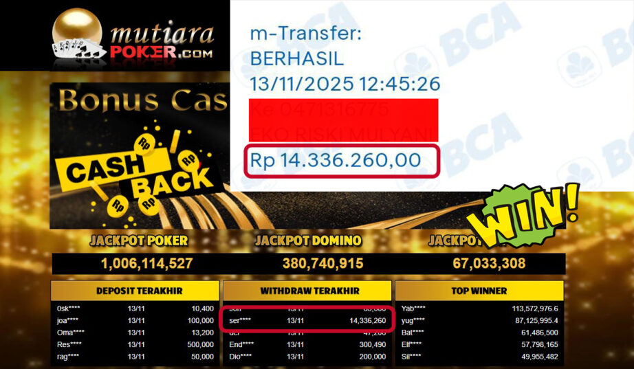 Bukti Withdraw ( 14,336,260,- ) Member Setia MutiaraPoker