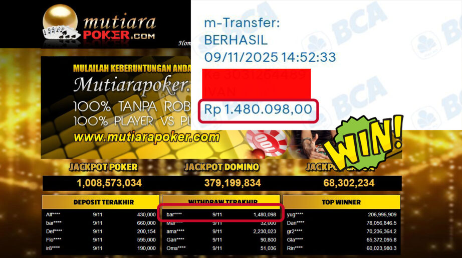 Bukti Withdraw ( 1,480,098,- ) Member Setia MutiaraPoker