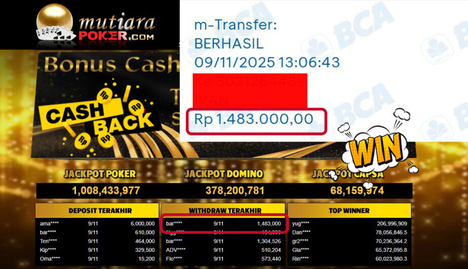 Bukti Withdraw ( 1,483,000,- ) Member Setia MutiaraPoker