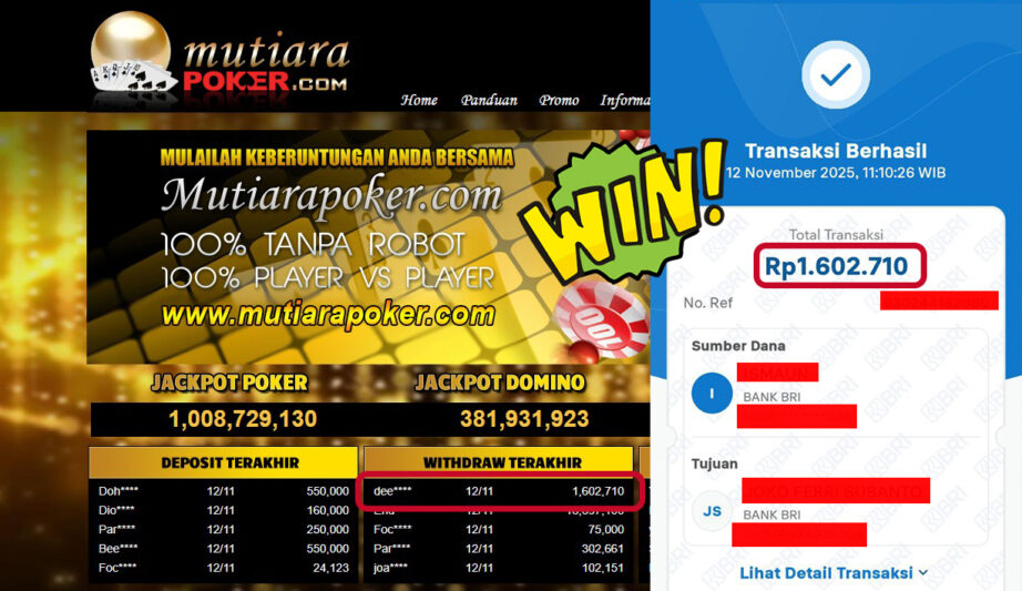 Bukti Withdraw ( 1,602,710,- ) Member Setia MutiaraPoker