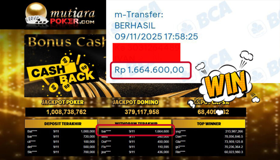 Bukti Withdraw ( 1,664,600,- ) Member Setia MutiaraPoker