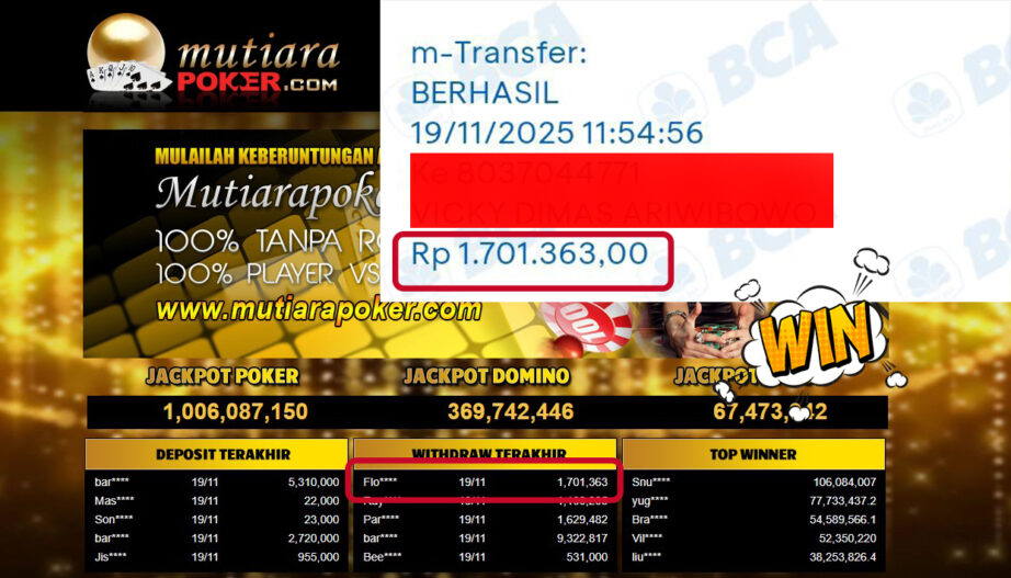 Bukti Withdraw ( 1,701,363,- ) Member Setia MutiaraPoker
