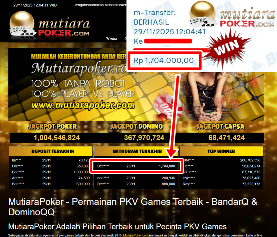 Bukti Withdraw ( 1,704,000,- ) Member Setia MutiaraPoker