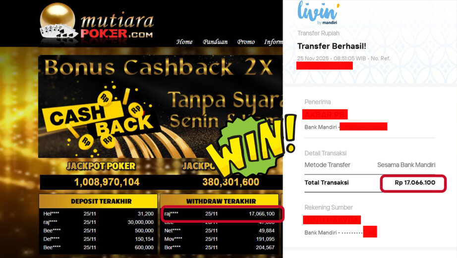 Bukti Withdraw ( 17,066,100,- ) Member Setia MutiaraPoker