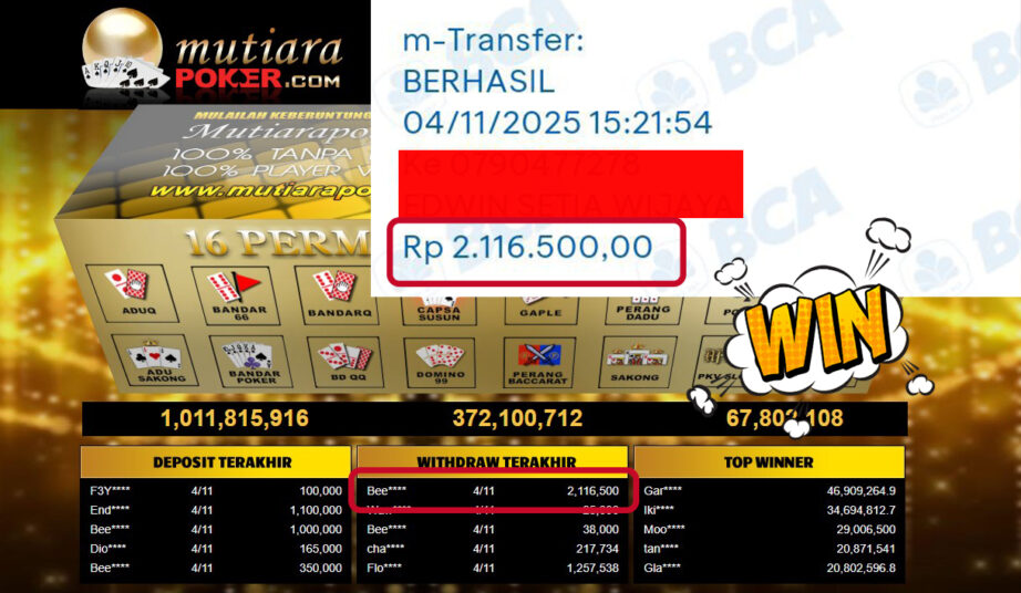 Bukti Withdraw ( 2,116,500,- ) Member Setia MutiaraPoker