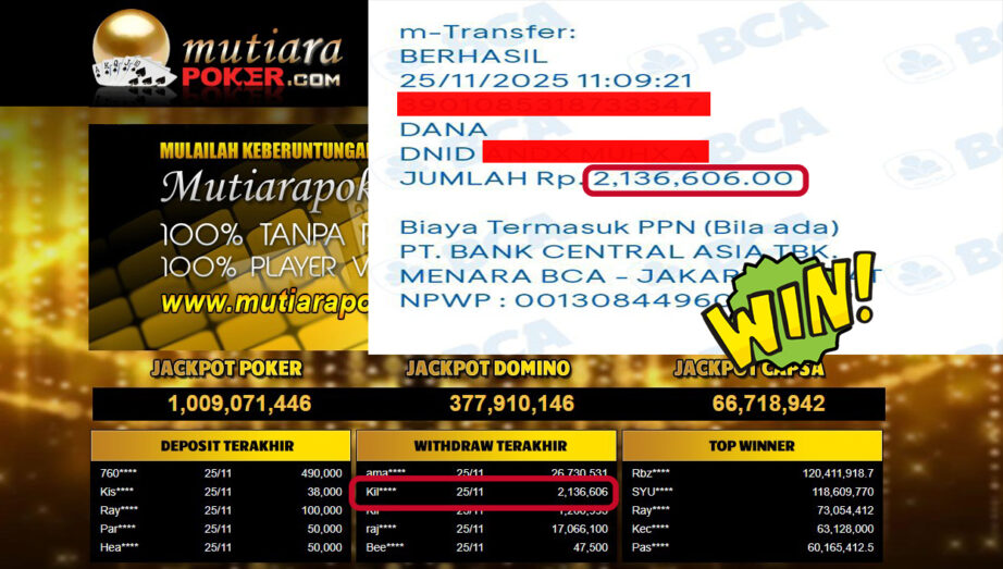 Bukti Withdraw ( 2,136,606,- ) Member Setia MutiaraPoker