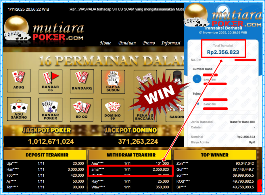 Bukti Withdraw ( 2,356,823,- ) Member Setia MutiaraPoker