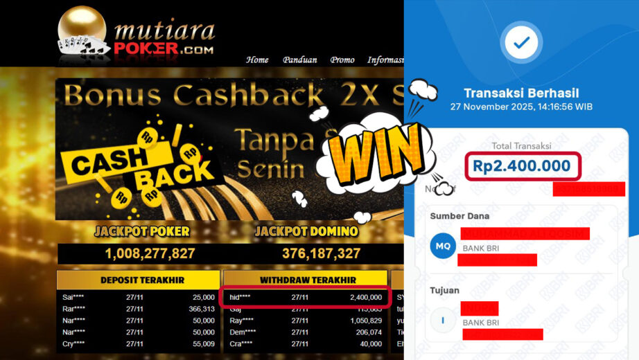 Bukti Withdraw ( 2,400,000,- ) Member Setia MutiaraPoker