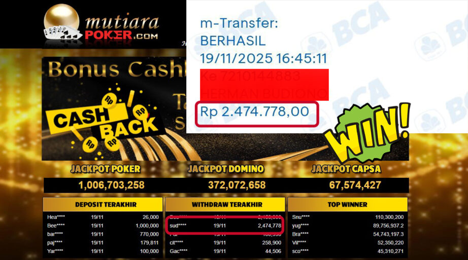 Bukti Withdraw ( 2,474,778,- ) Member Setia MutiaraPoker
