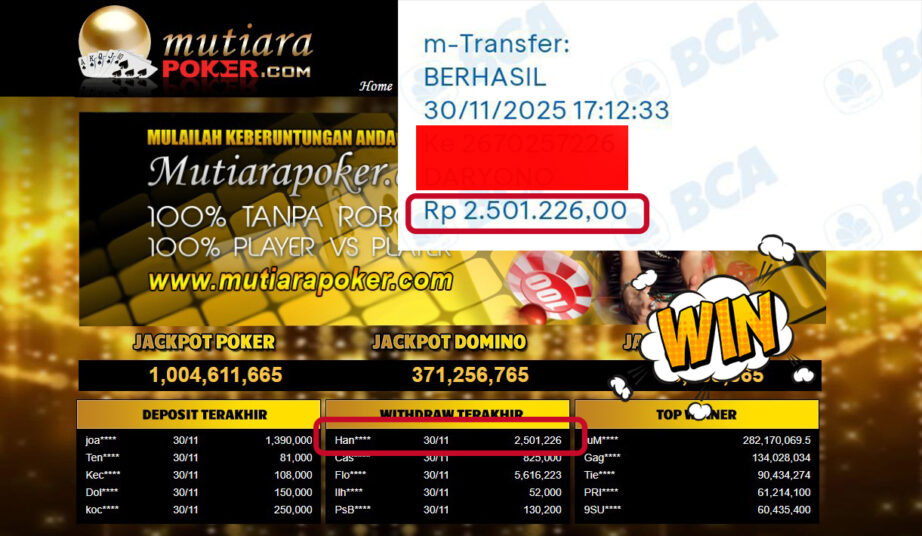 Bukti Withdraw ( 2,501,226,- ) Member Setia MutiaraPoker