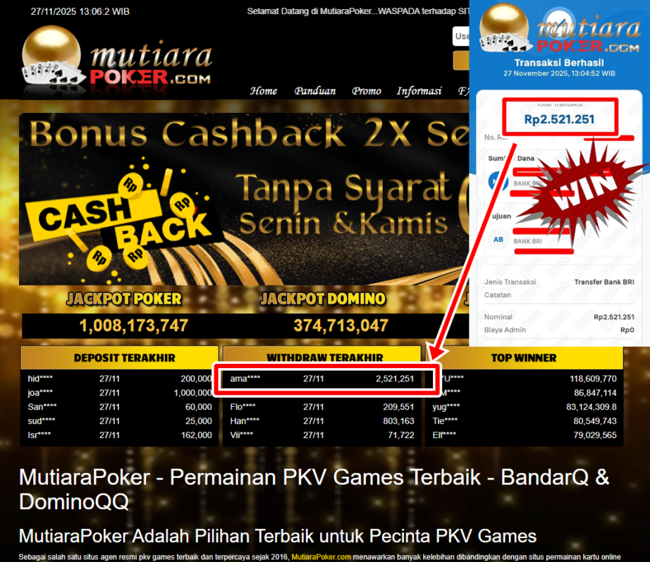Bukti Withdraw ( 2,521,251,- ) Member Setia MutiaraPoker