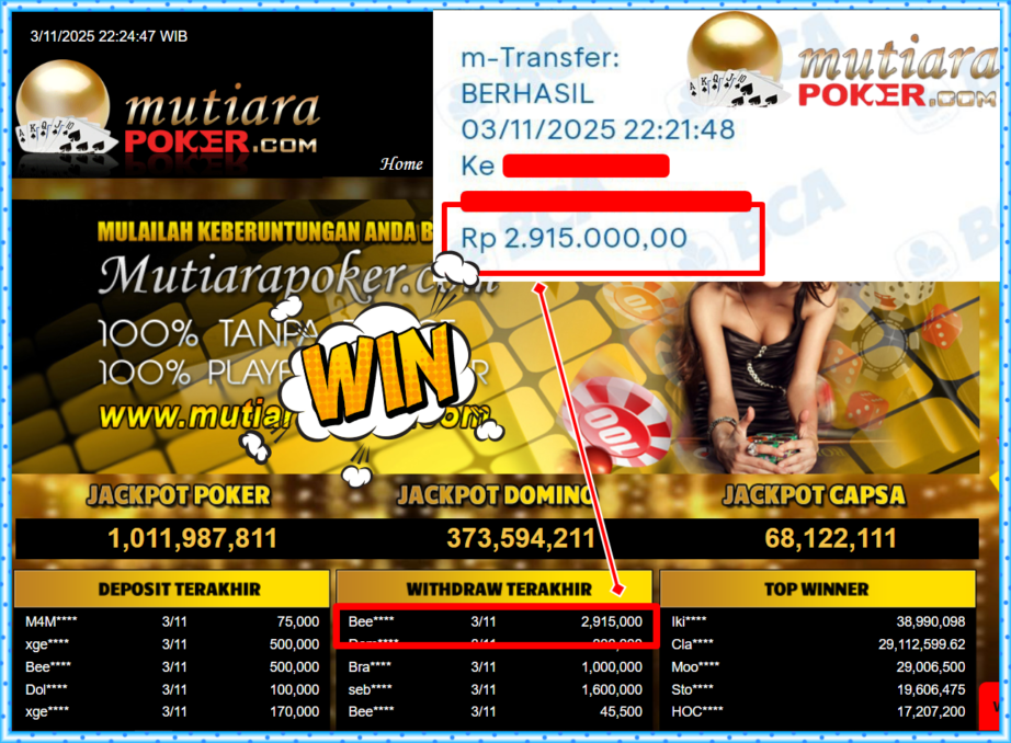 Bukti Withdraw ( 2,915,000,- ) Member Setia MutiaraPoker