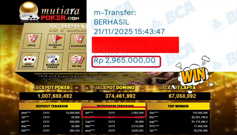 Bukti Withdraw ( 2,965,000,- ) Member Setia MutiaraPoker