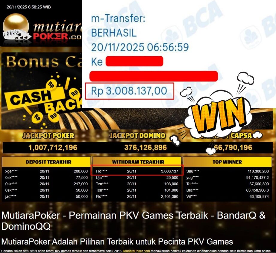 Bukti Withdraw ( 3.008.137,- ) Member Setia MutiaraPoker