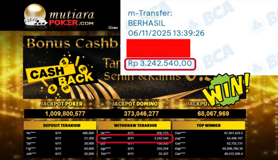 Bukti Withdraw ( 3,242,540,- ) Member Setia MutiaraPoker